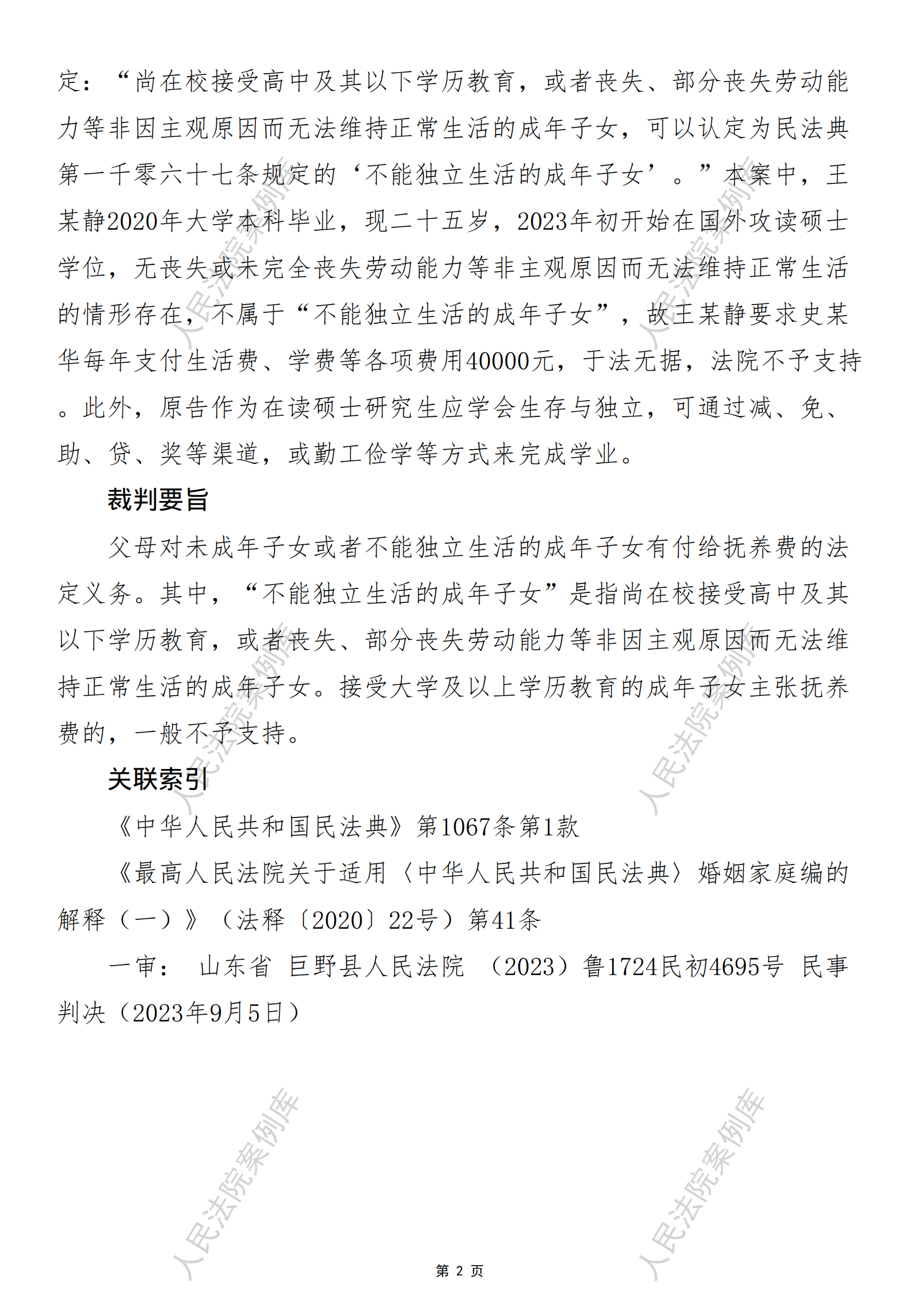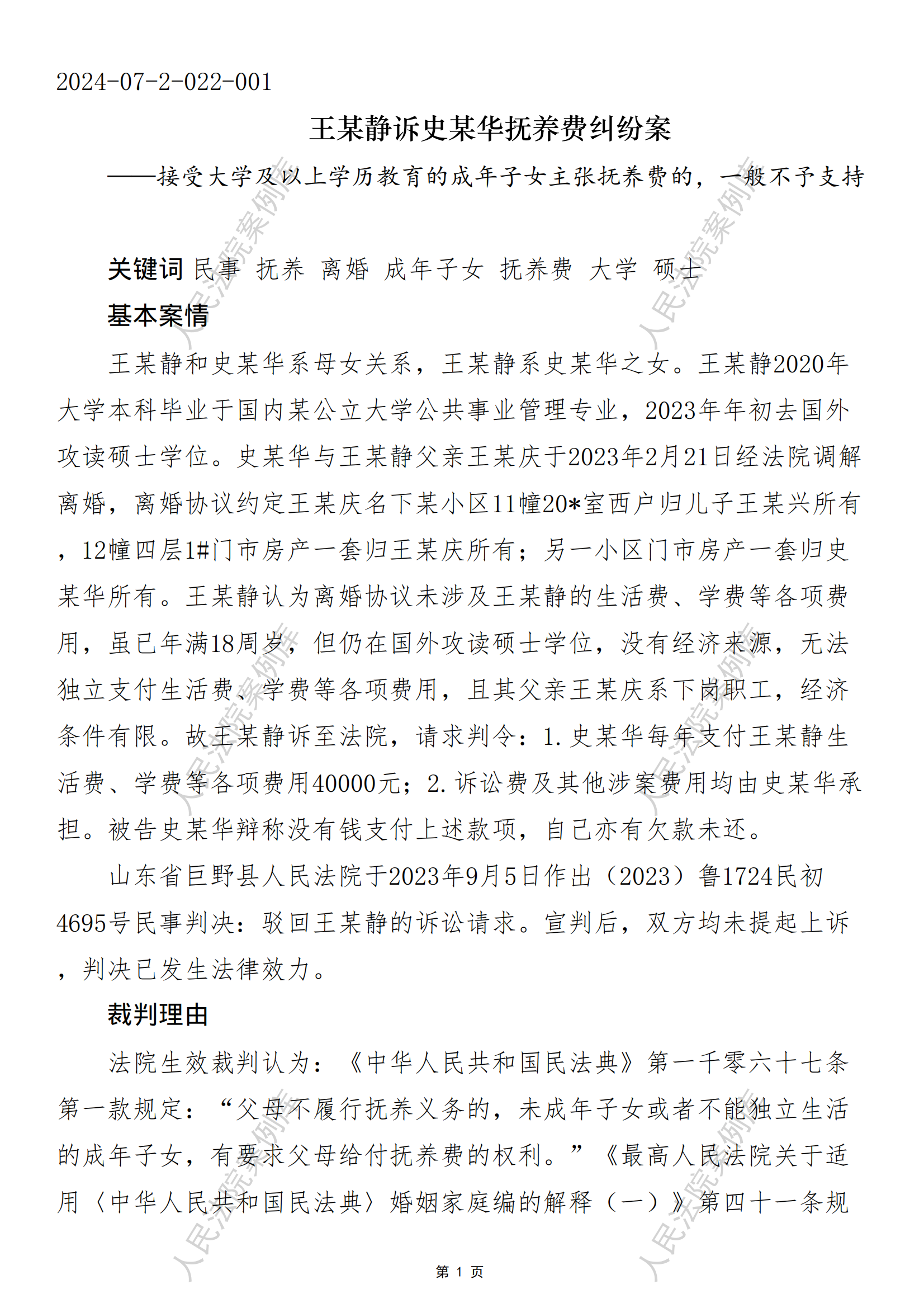 核心提示:——接受大学及以上学历教育的成年子女主张抚养费的,一般不予支持