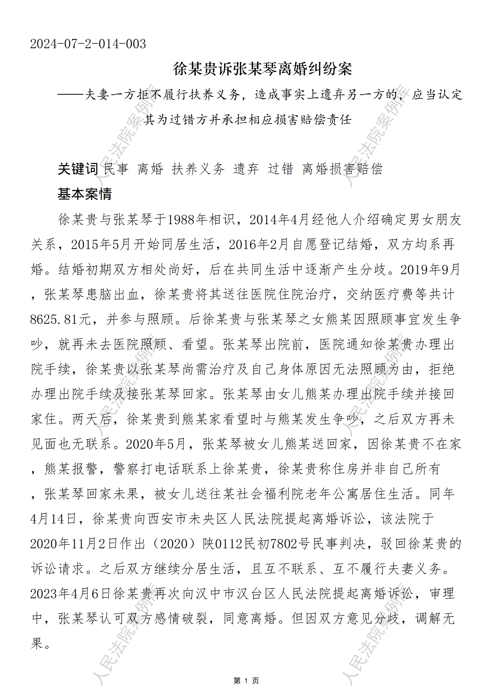 徐某贵诉张某琴离婚纠纷案
