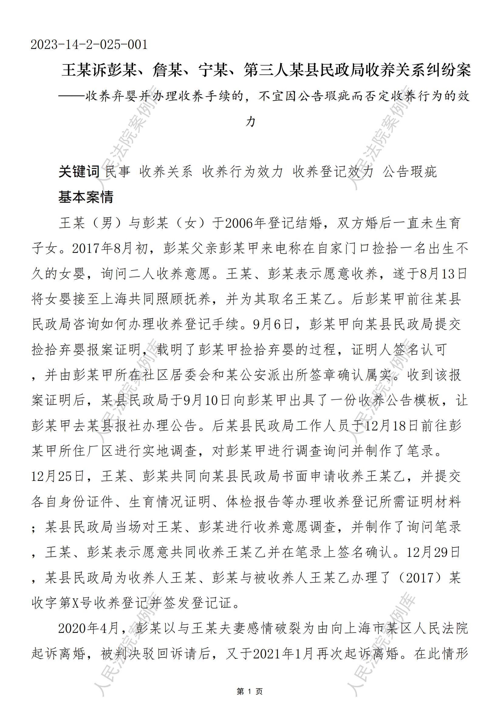 王某诉彭某、詹某、宁某、第三人某县民政局收养关系纠纷案