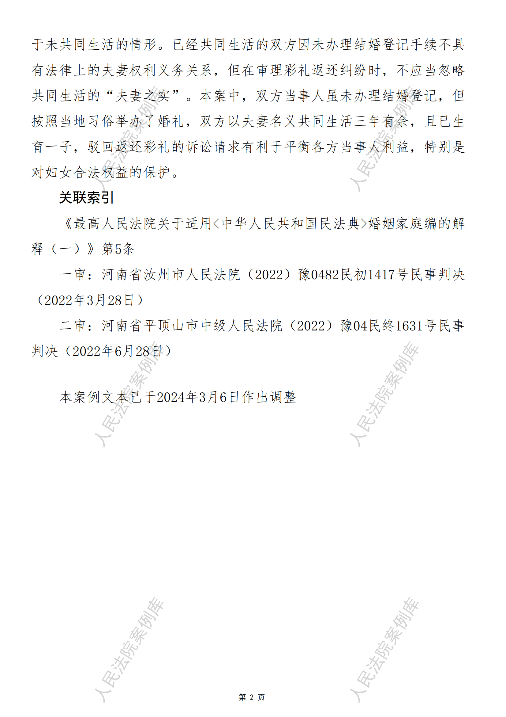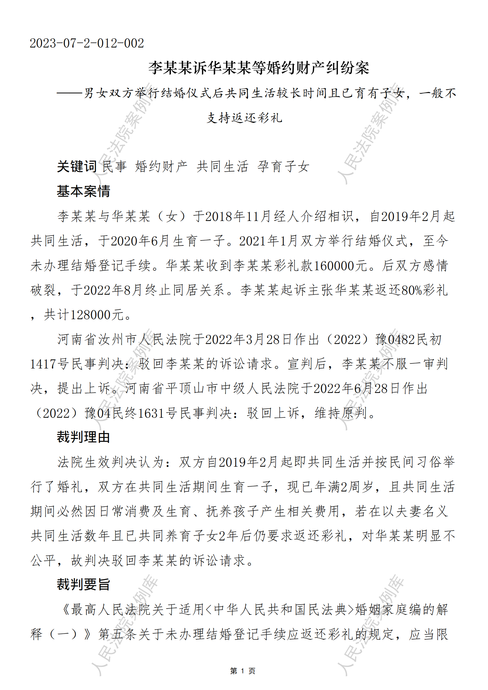 核心提示:——男女双方举行结婚仪式后共同生活较长时间且已育有子女,一般不支持返还彩礼