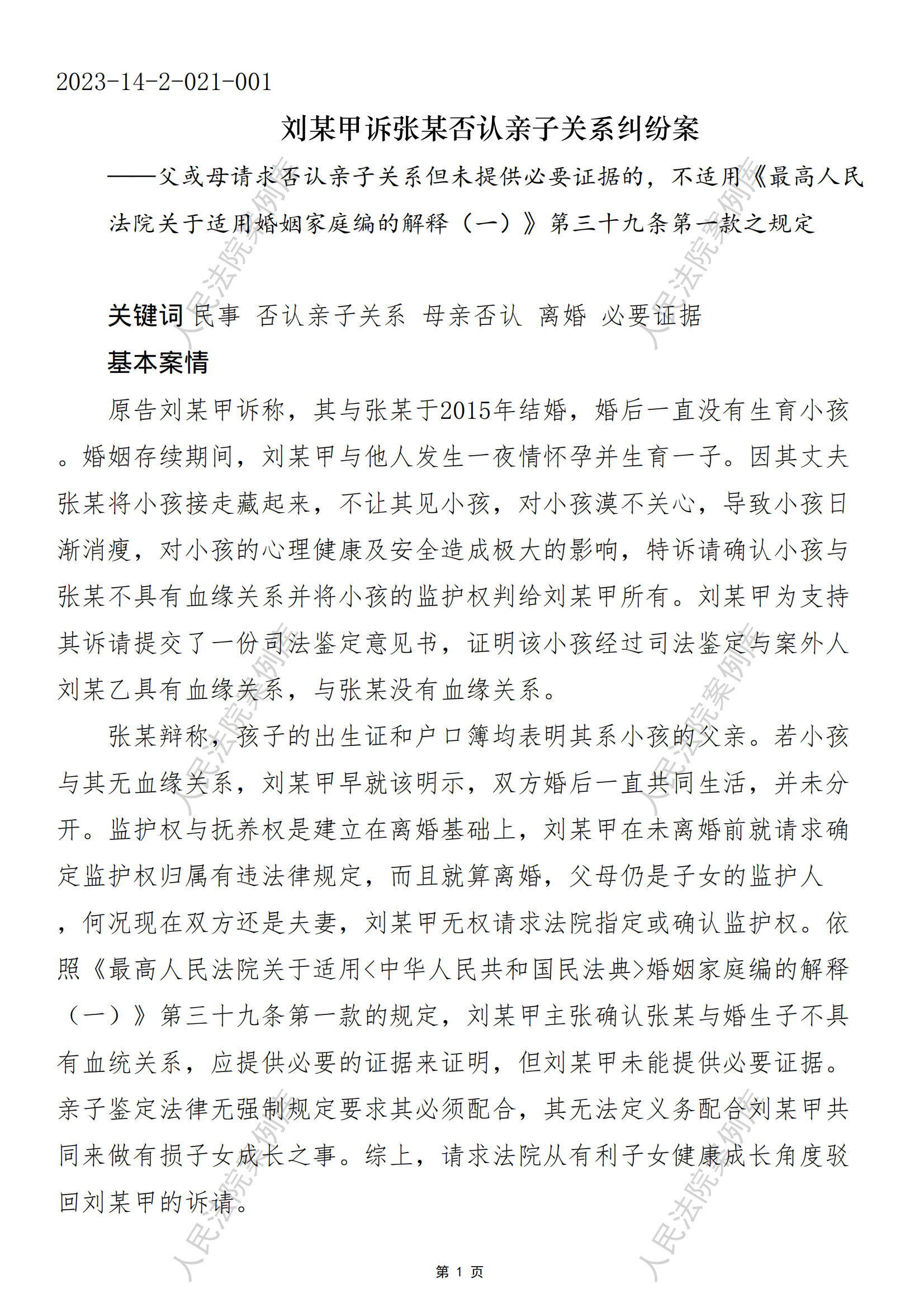 核心提示:——父或母请求否认亲子关系但未提供必要证据的,不适用《最高人民法院关于适用婚姻家庭编的解释(一)》第三十九条第一款之规定