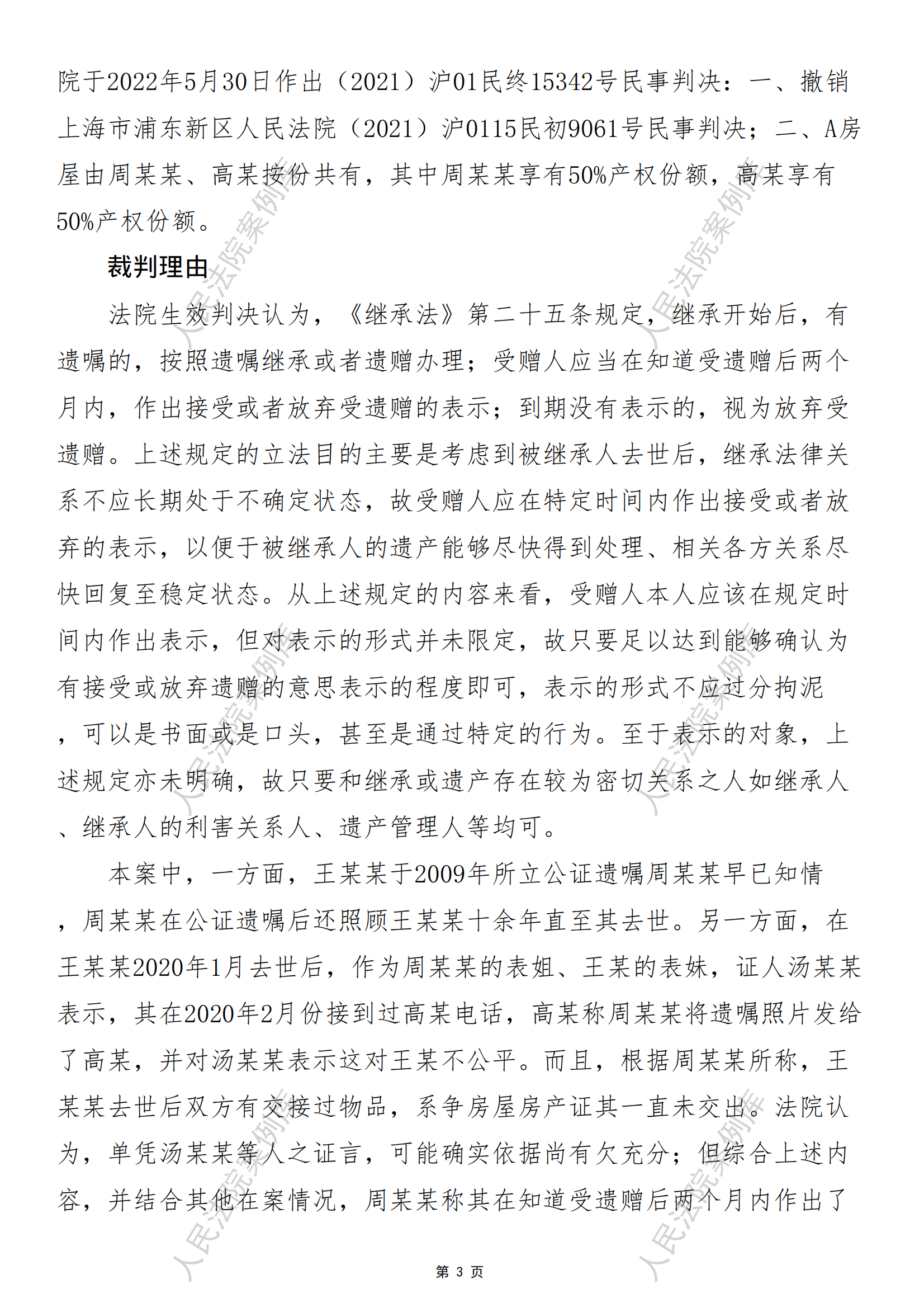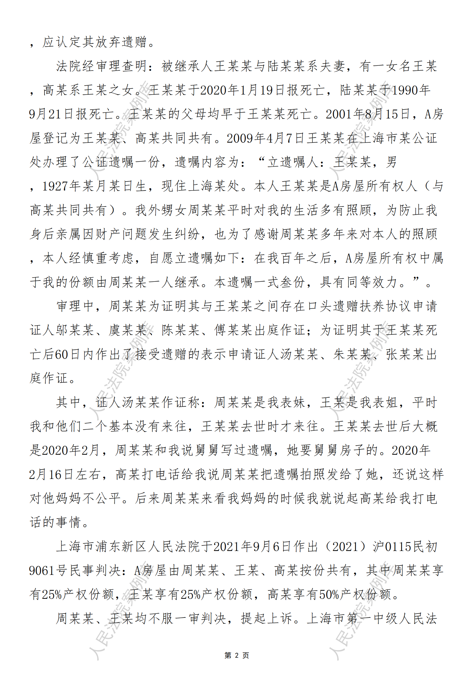 周某某与王某等共有纠纷、遗嘱继承纠纷案