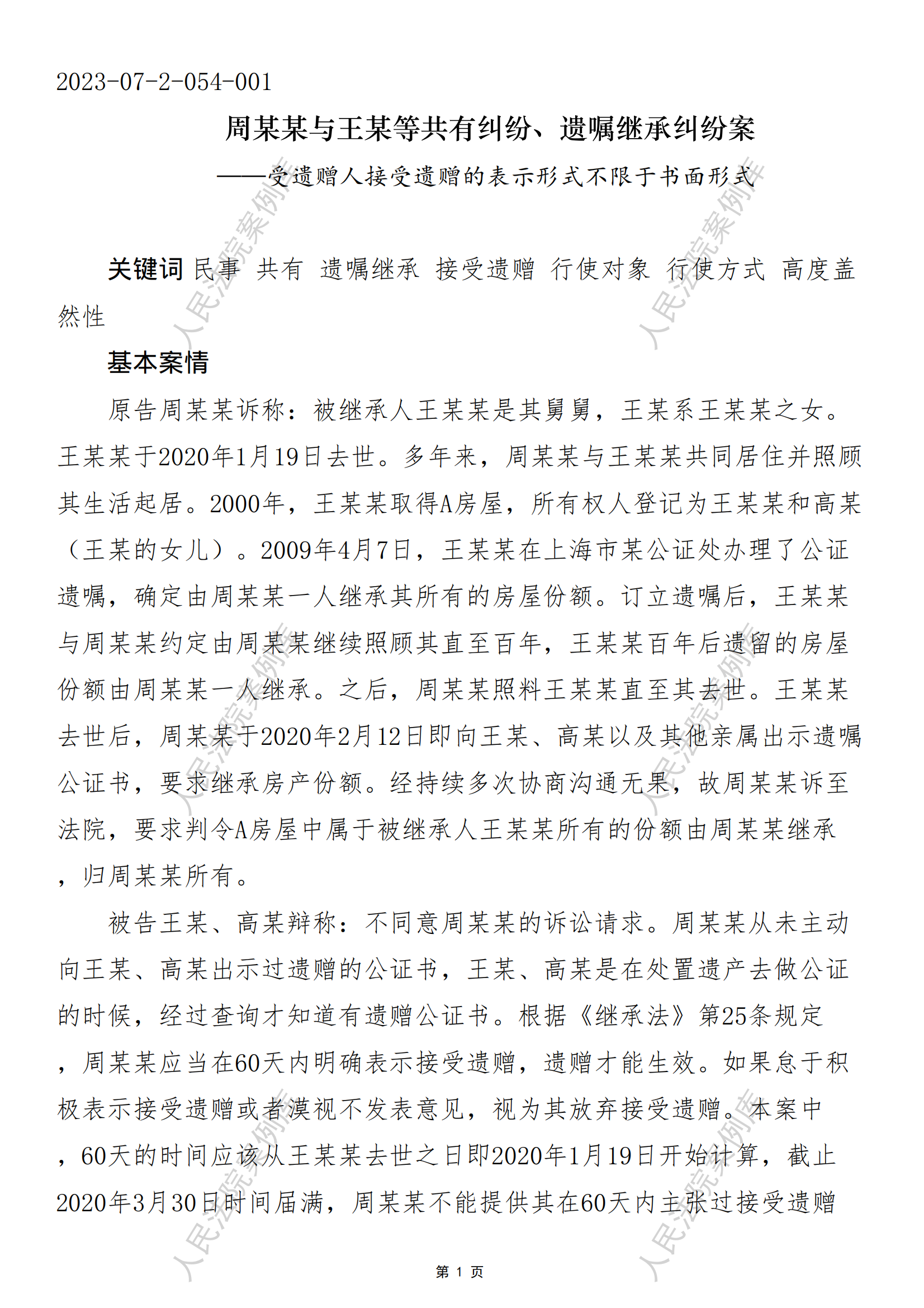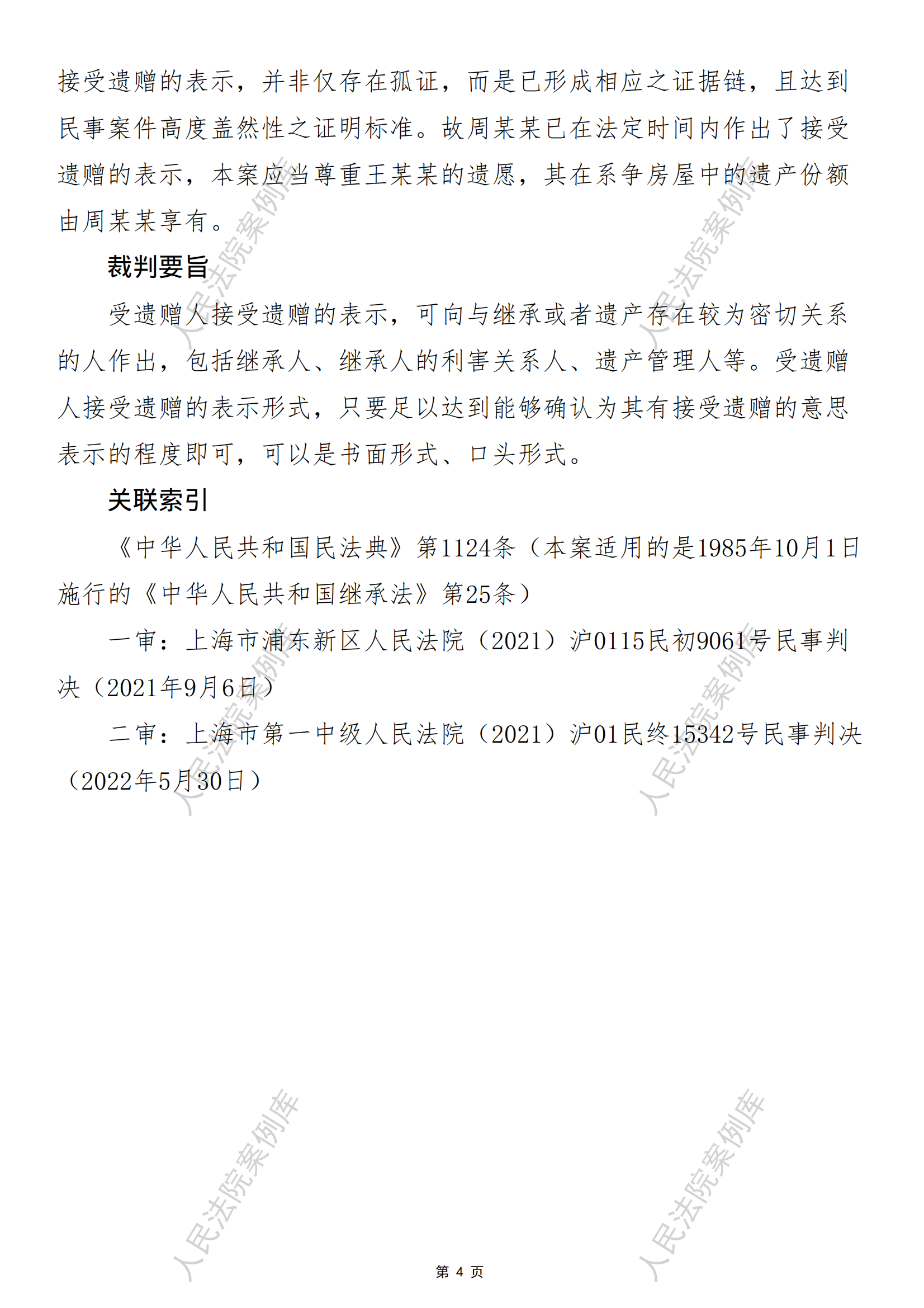 核心提示:——受遗赠人接受遗赠的表示形式不限于书面形式