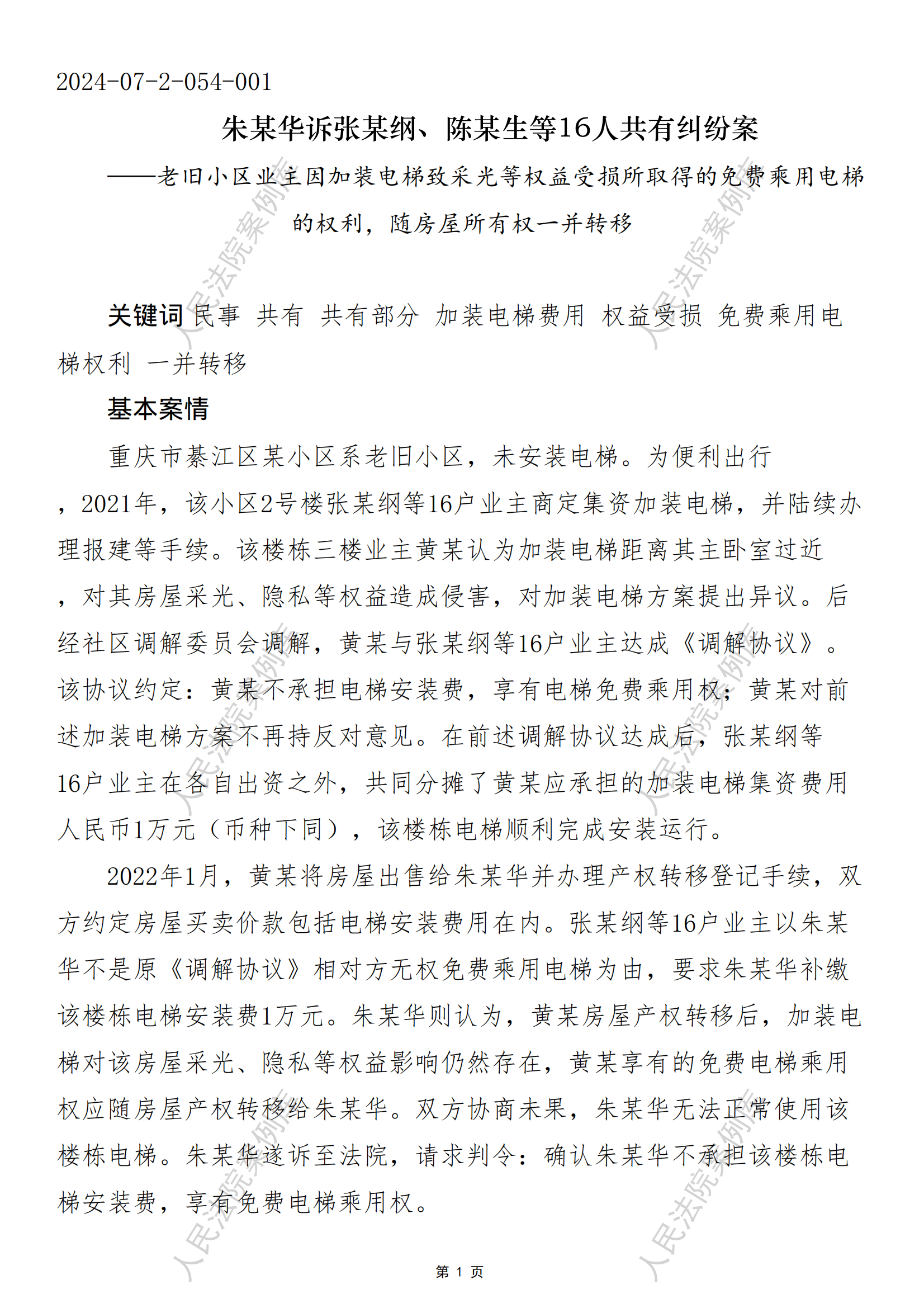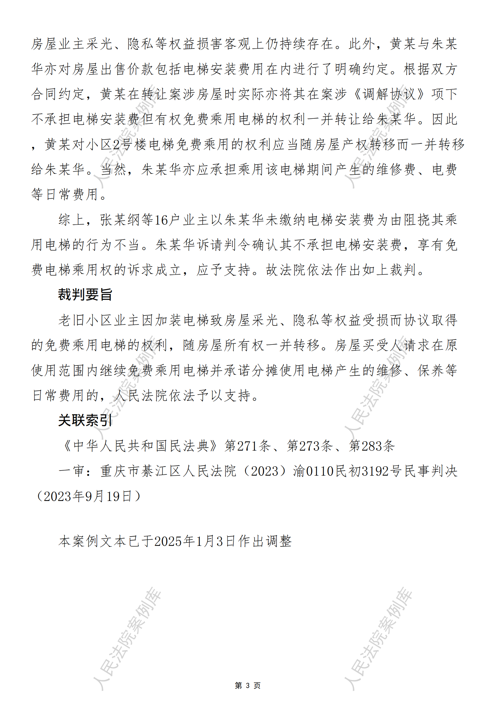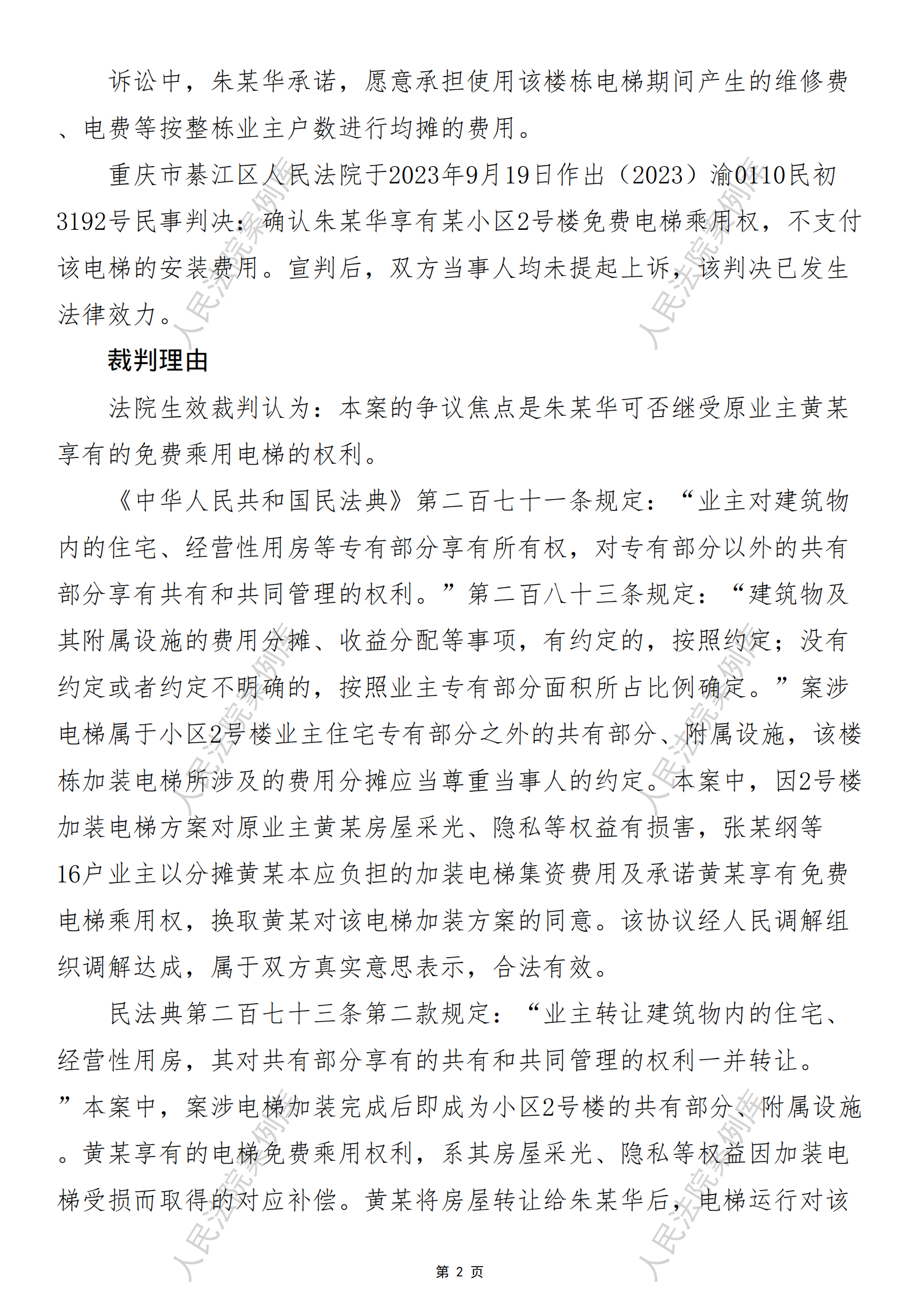 核心提示:——老旧小区业主因加装电梯致采光等权益受损所取得的免费乘用电梯的权利,随房屋所有权一并转移