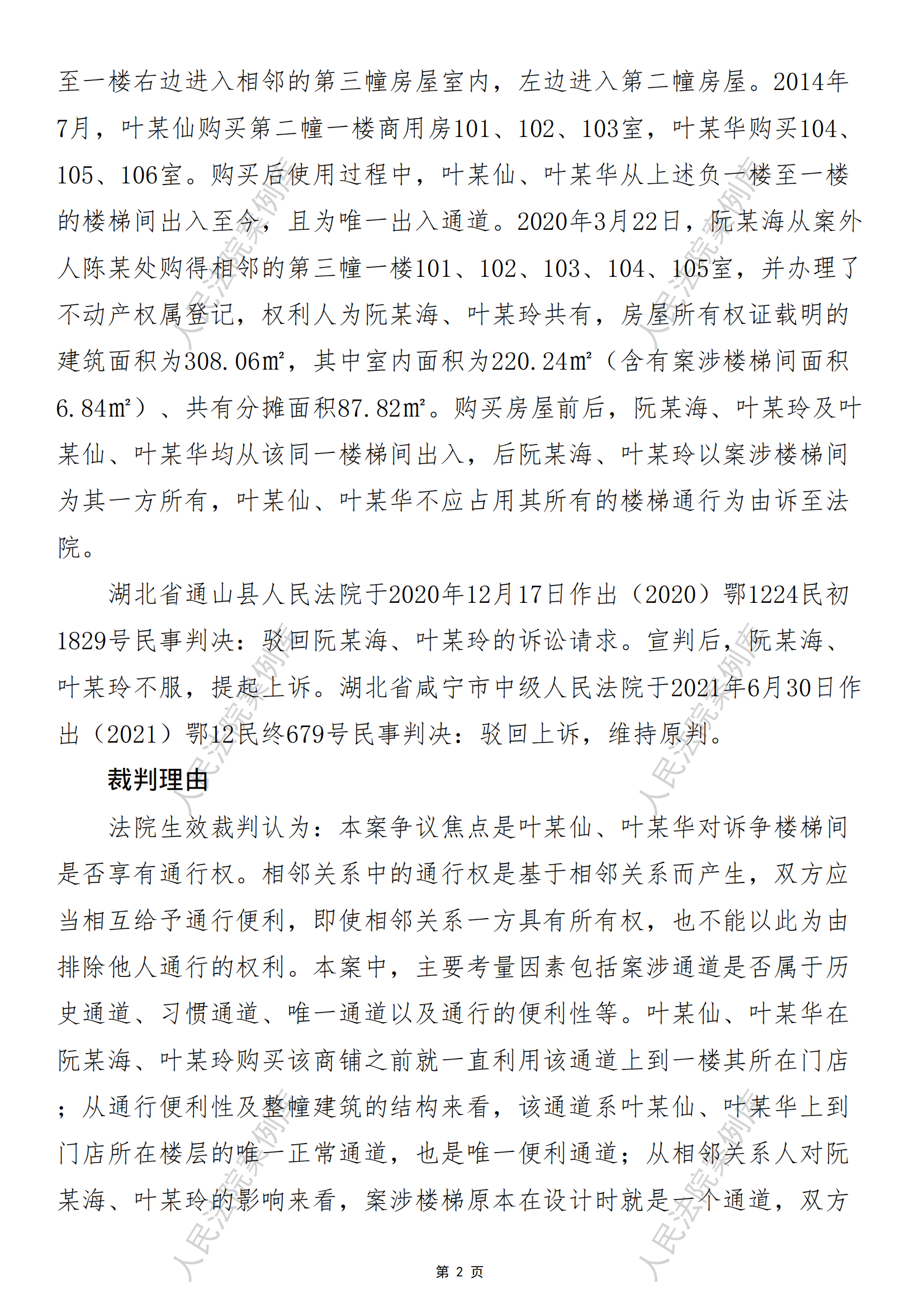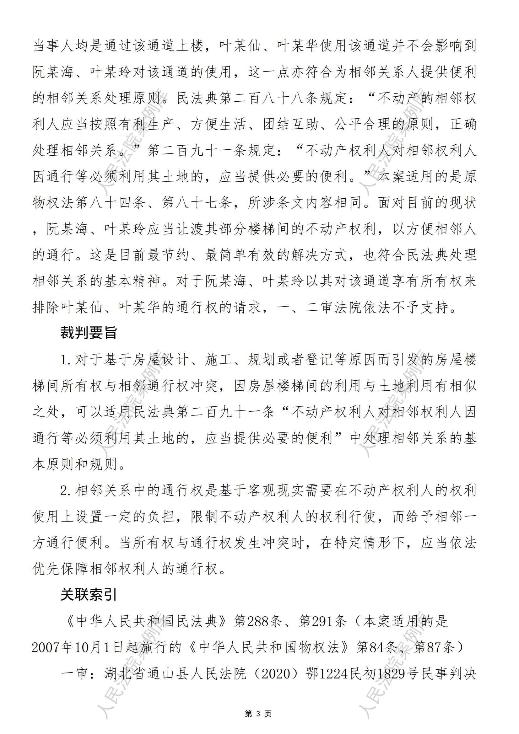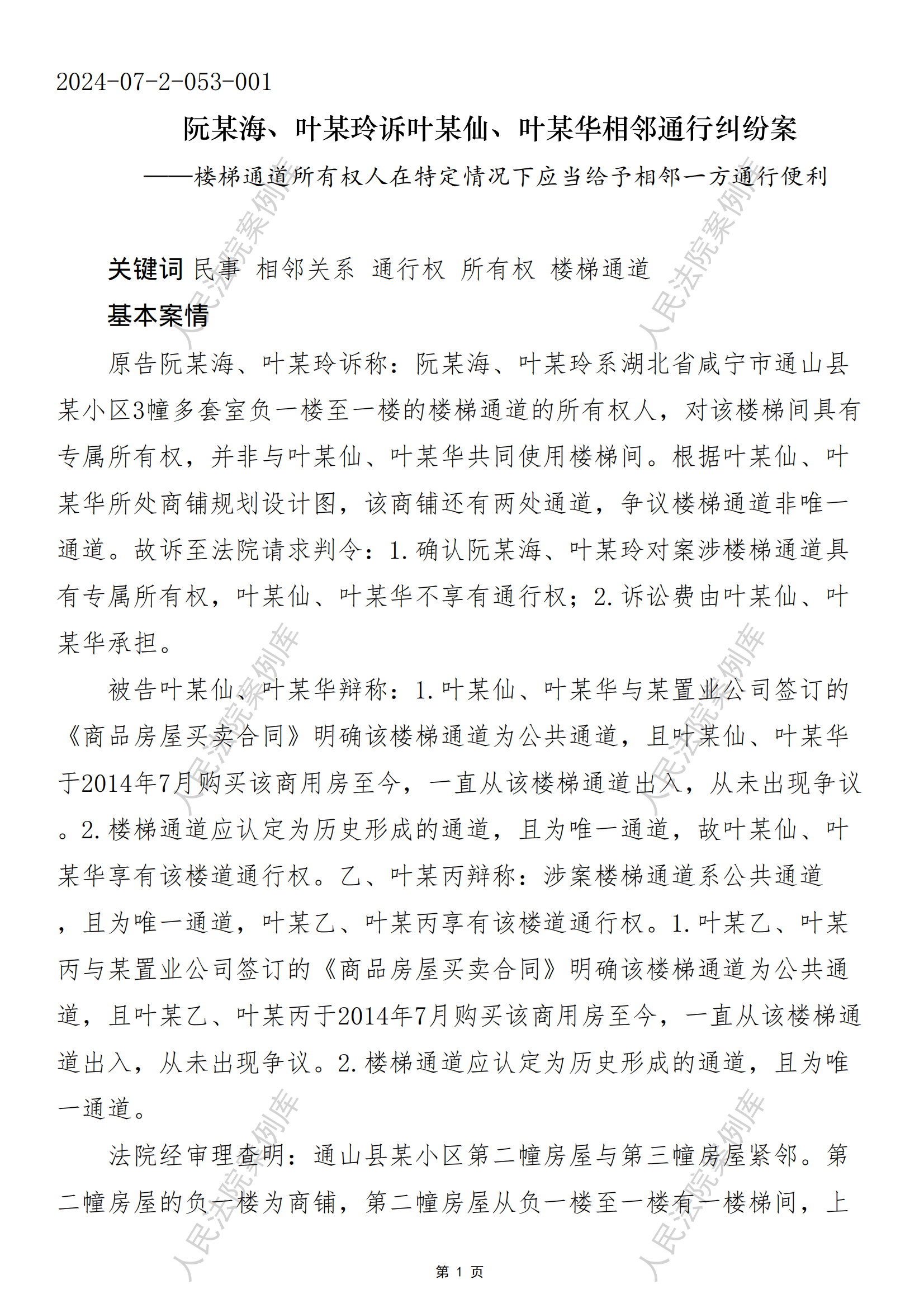 核心提示:——楼梯通道所有权人在特定情况下应当给予相邻一方通行便利