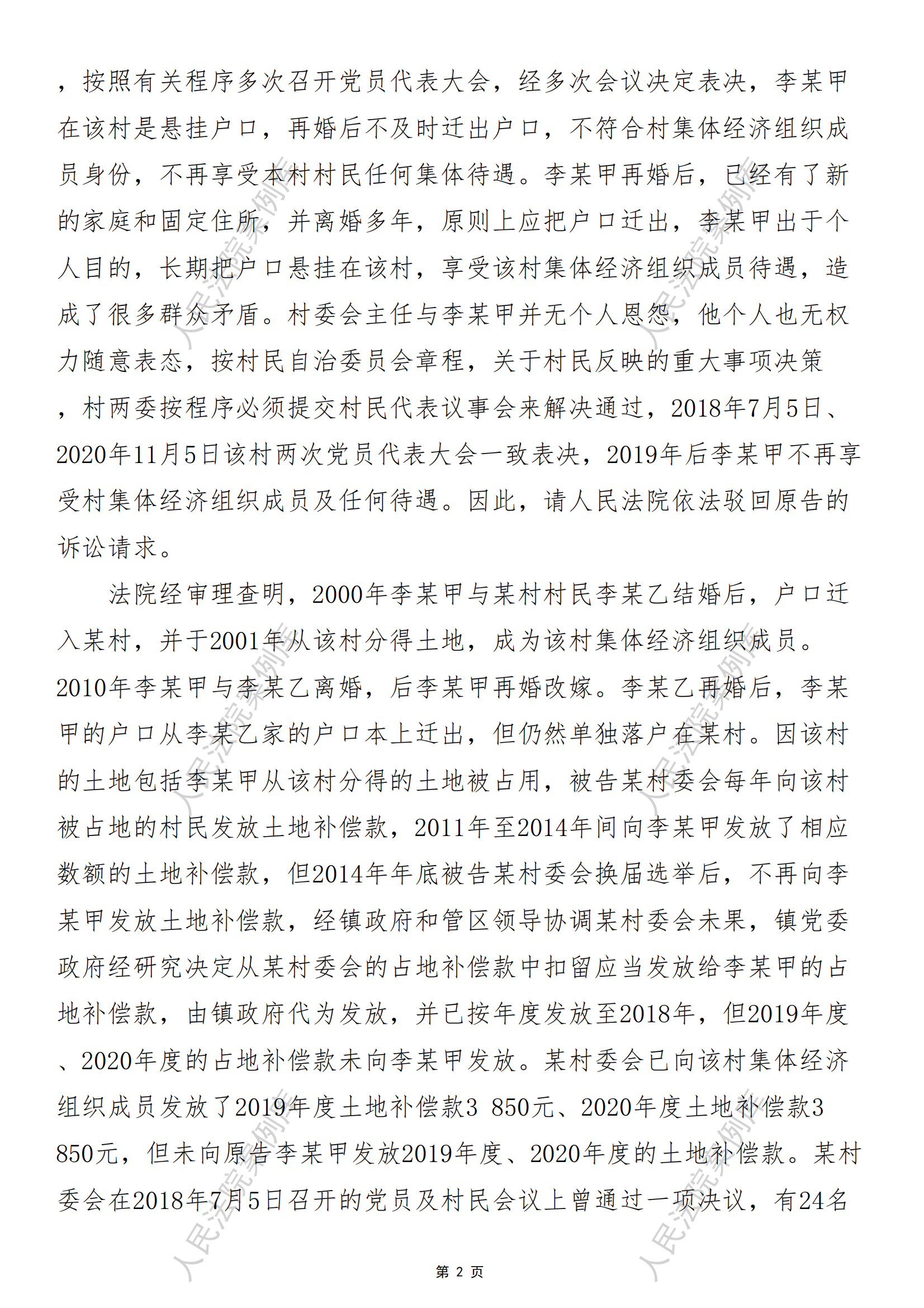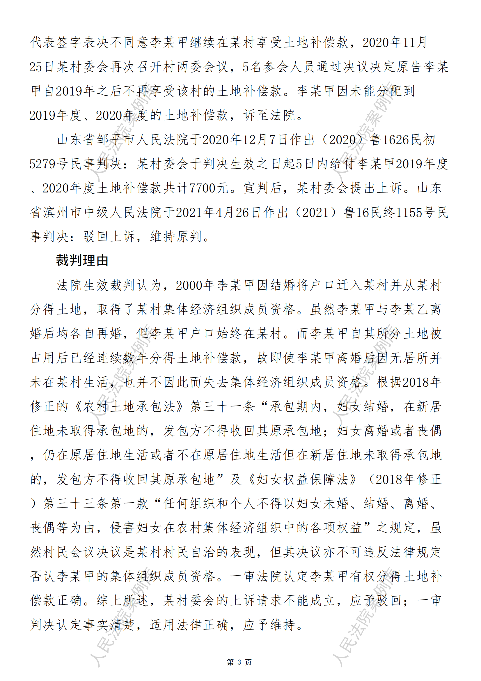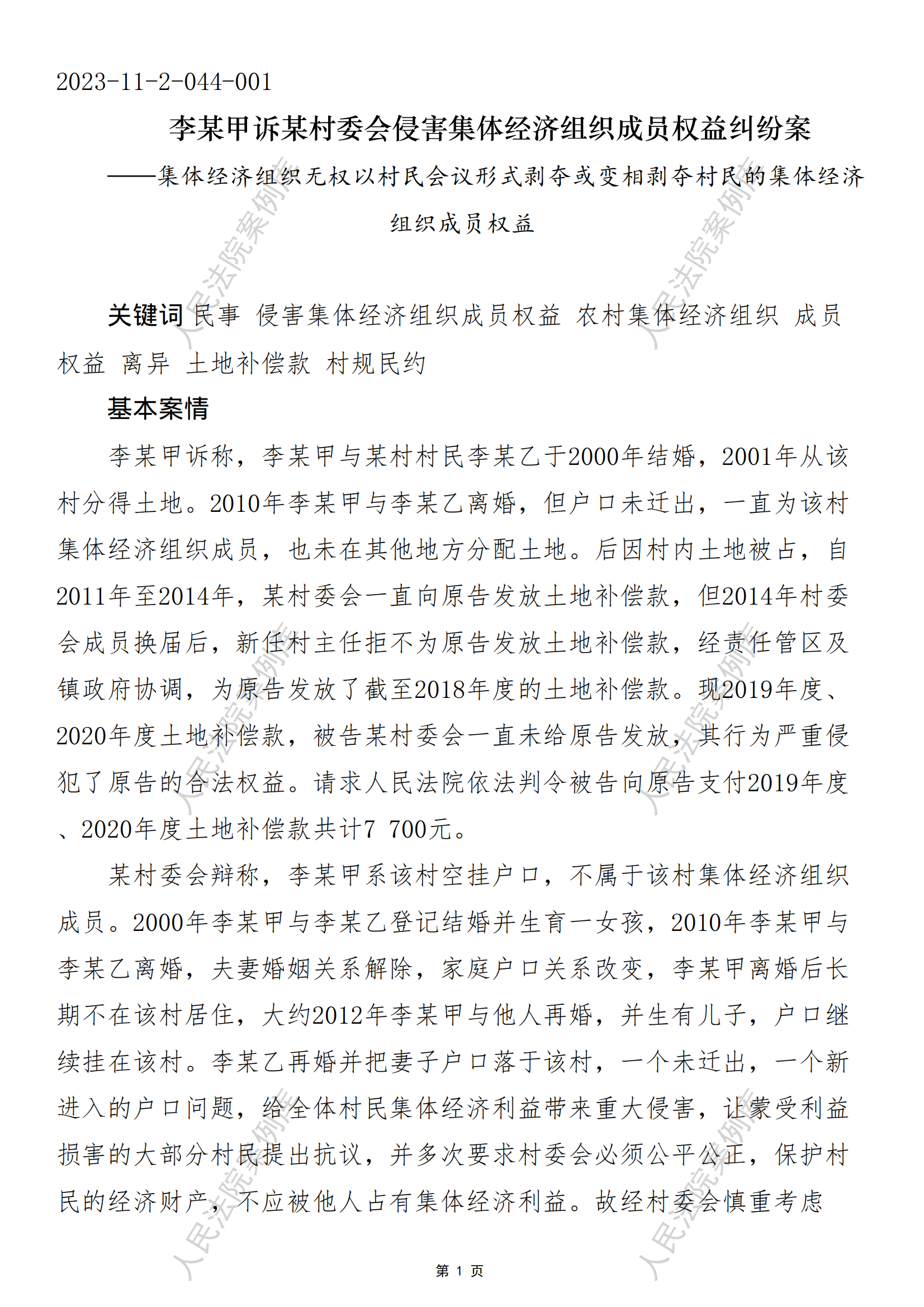 核心提示:关键词 民事 侵害集体经济组织成员权益 农村集体经济组织 成员权益 离异 土地补偿款 村规民约
