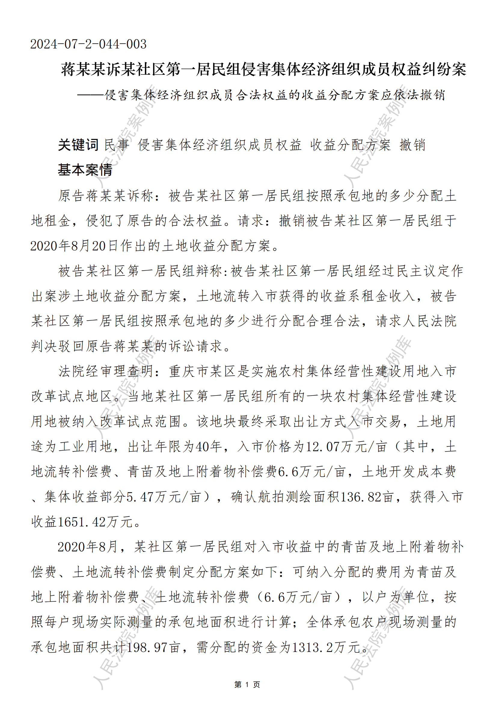 蒋某某诉某社区第一居民组侵害集体经济组织成员权益纠纷案