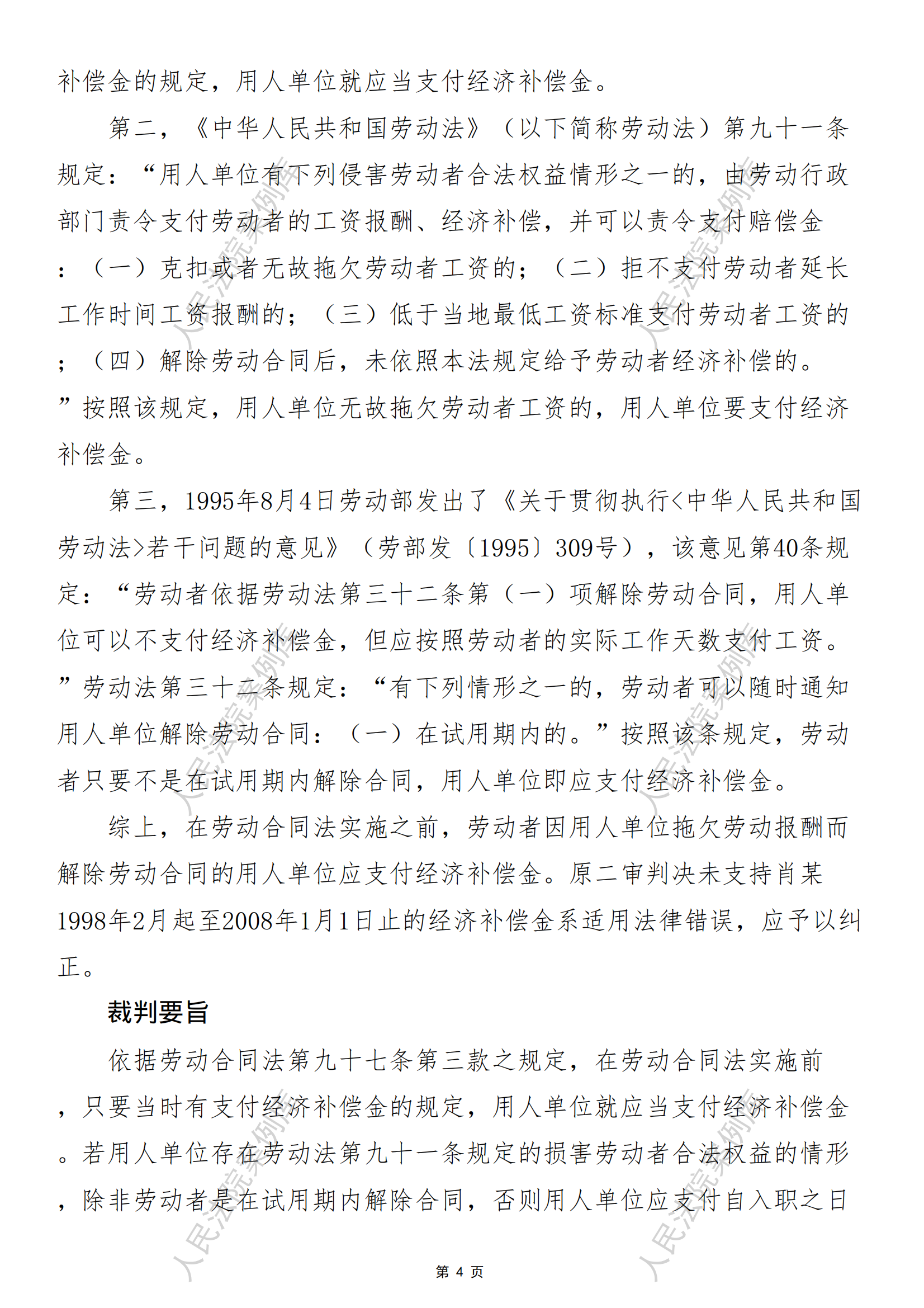 核心提示:——劳动合同法实施之前,劳动者因用人单位拖欠劳动报酬而解除劳动合同的,用人单位应支付自入职之日起至劳动合同法实施之日止的经济补偿金