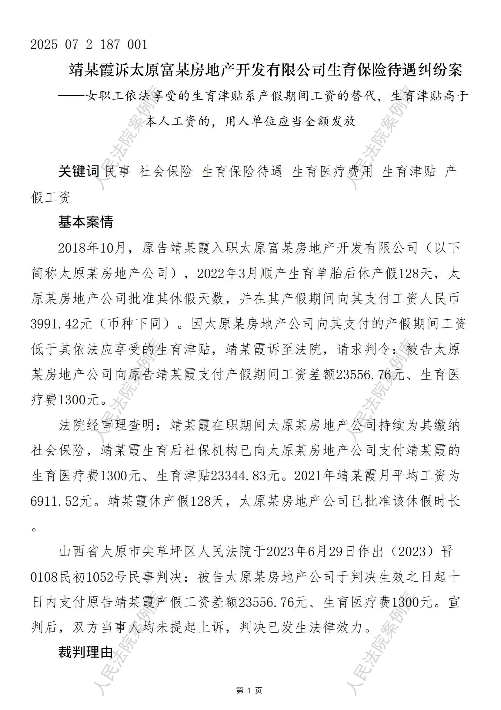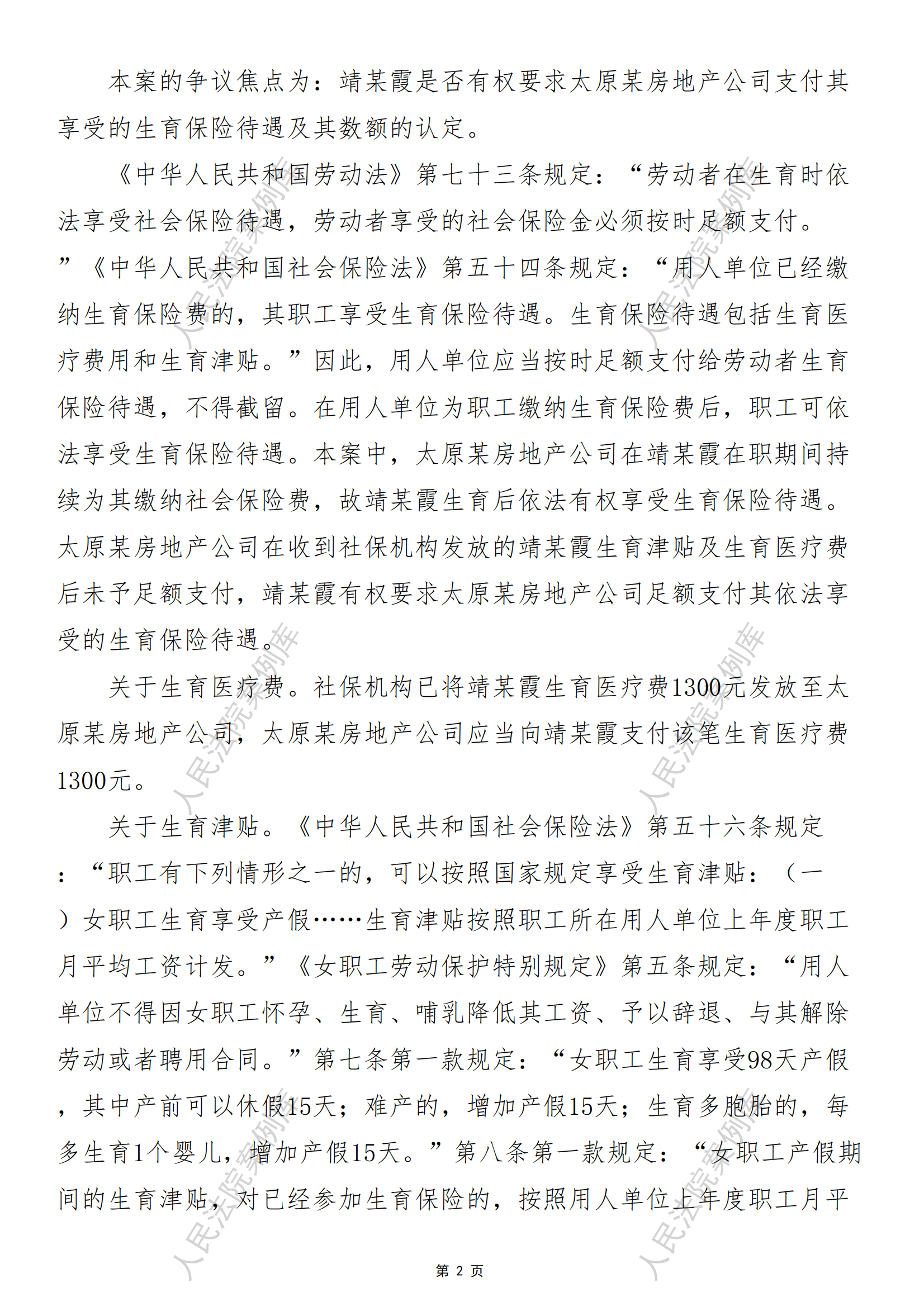 靖某霞诉太原富某房地产开发有限公司生育保险待遇纠纷案