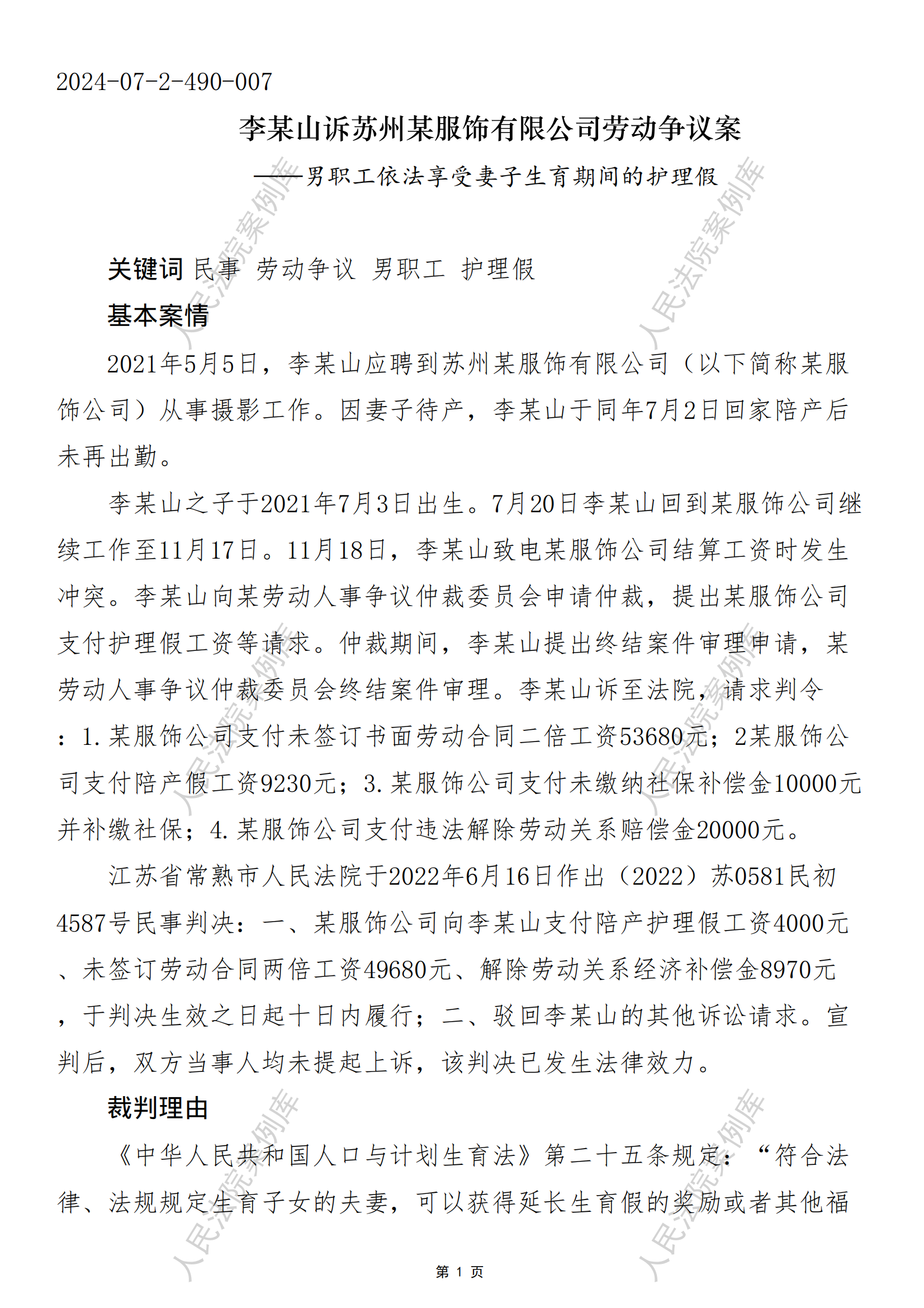 李某山诉苏州某服饰有限公司劳动争议案