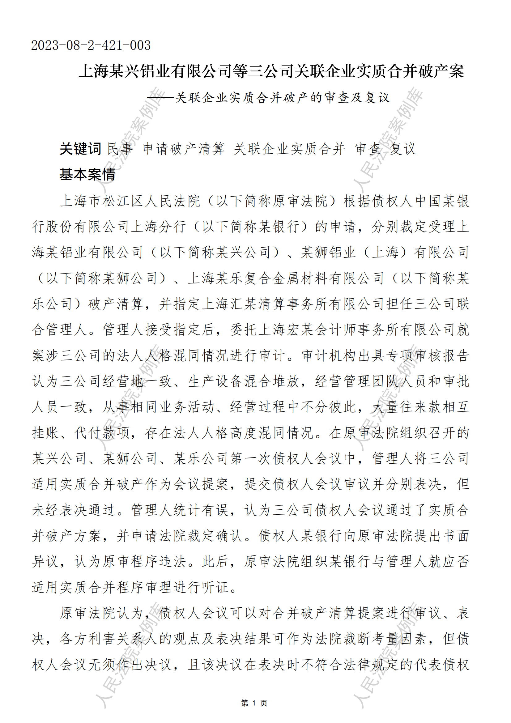 上海某兴铝业有限公司等三公司关联企业实质合并破产案