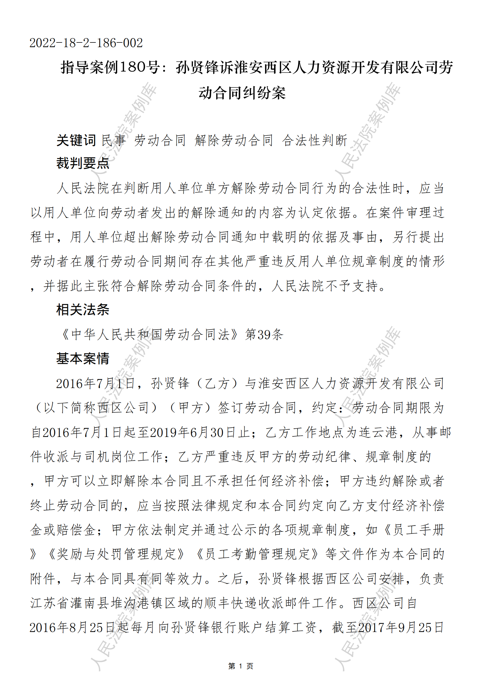指导案例180号:孙贤锋诉淮安西区人力资源开发有限公司劳