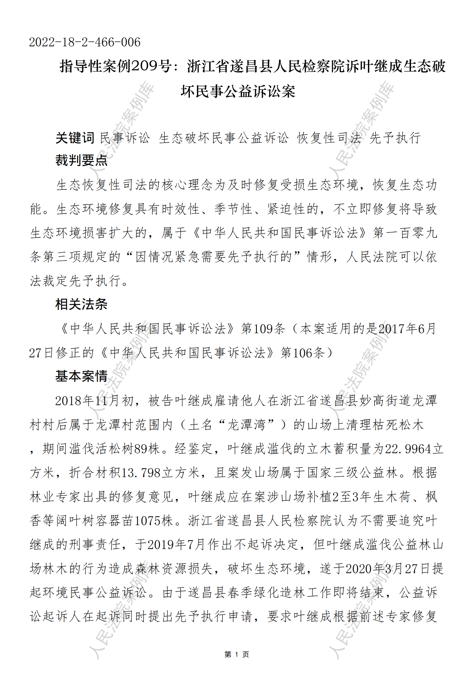 指导性案例209号:浙江省遂昌县人民检察院诉叶继成生态破