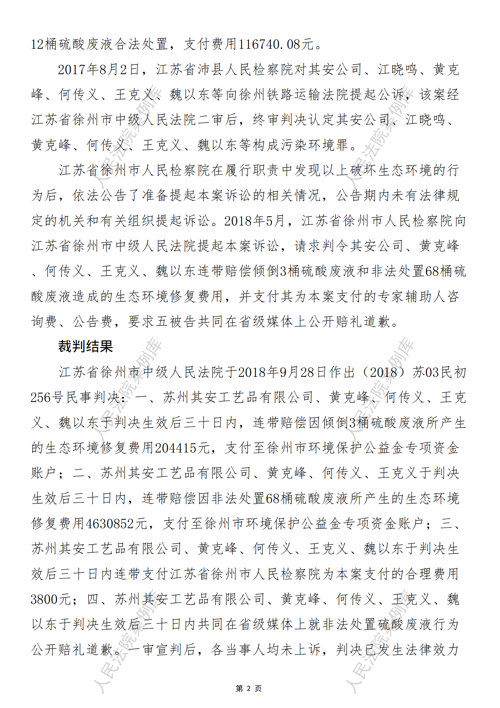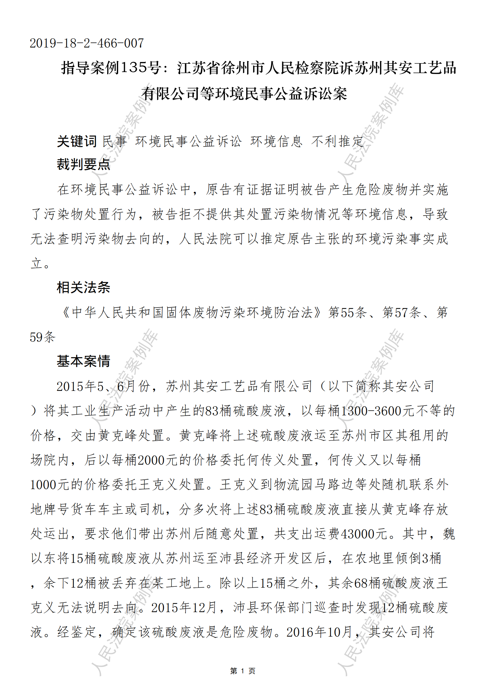 指导案例135号:江苏省徐州市人民检察院诉苏州其安工艺品 有限公司等环境民事公益诉讼案