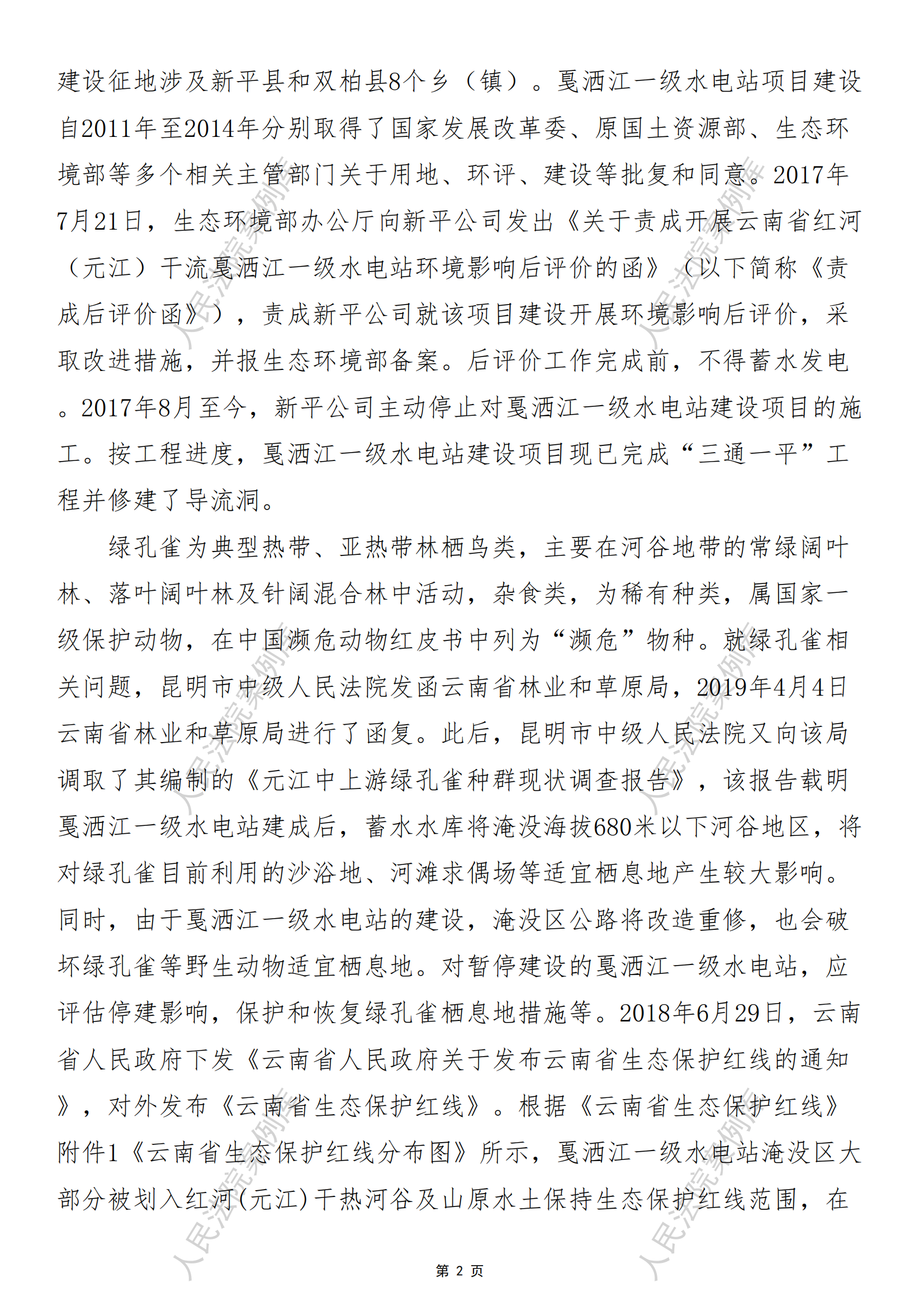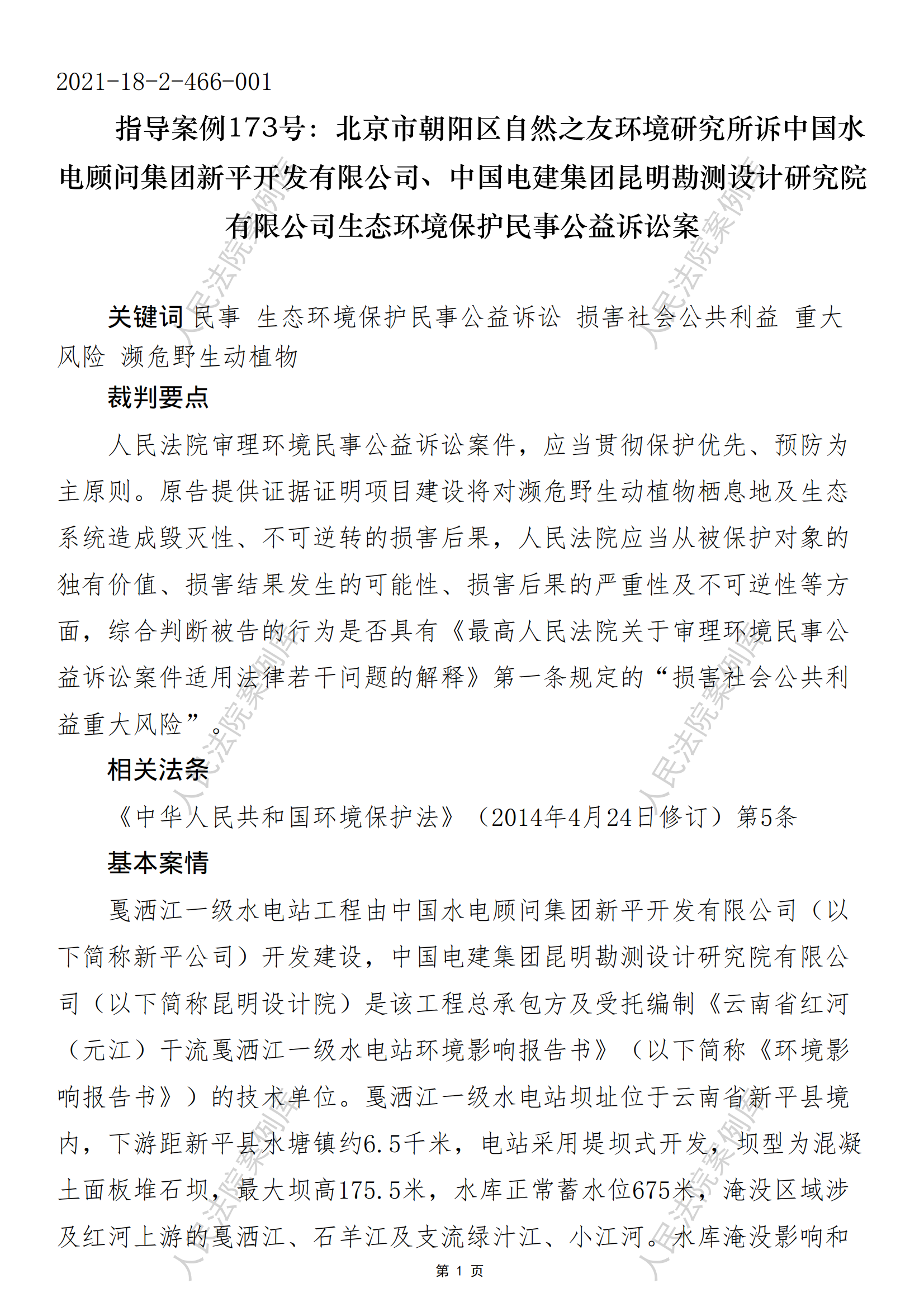 指导案例173号:北京市朝阳区自然之友环境研究所诉中国水 电顾问集团新平开发有限公司、中国电建集团昆明勘测设计研究院 有限公司生态环境保护民事公益诉讼案