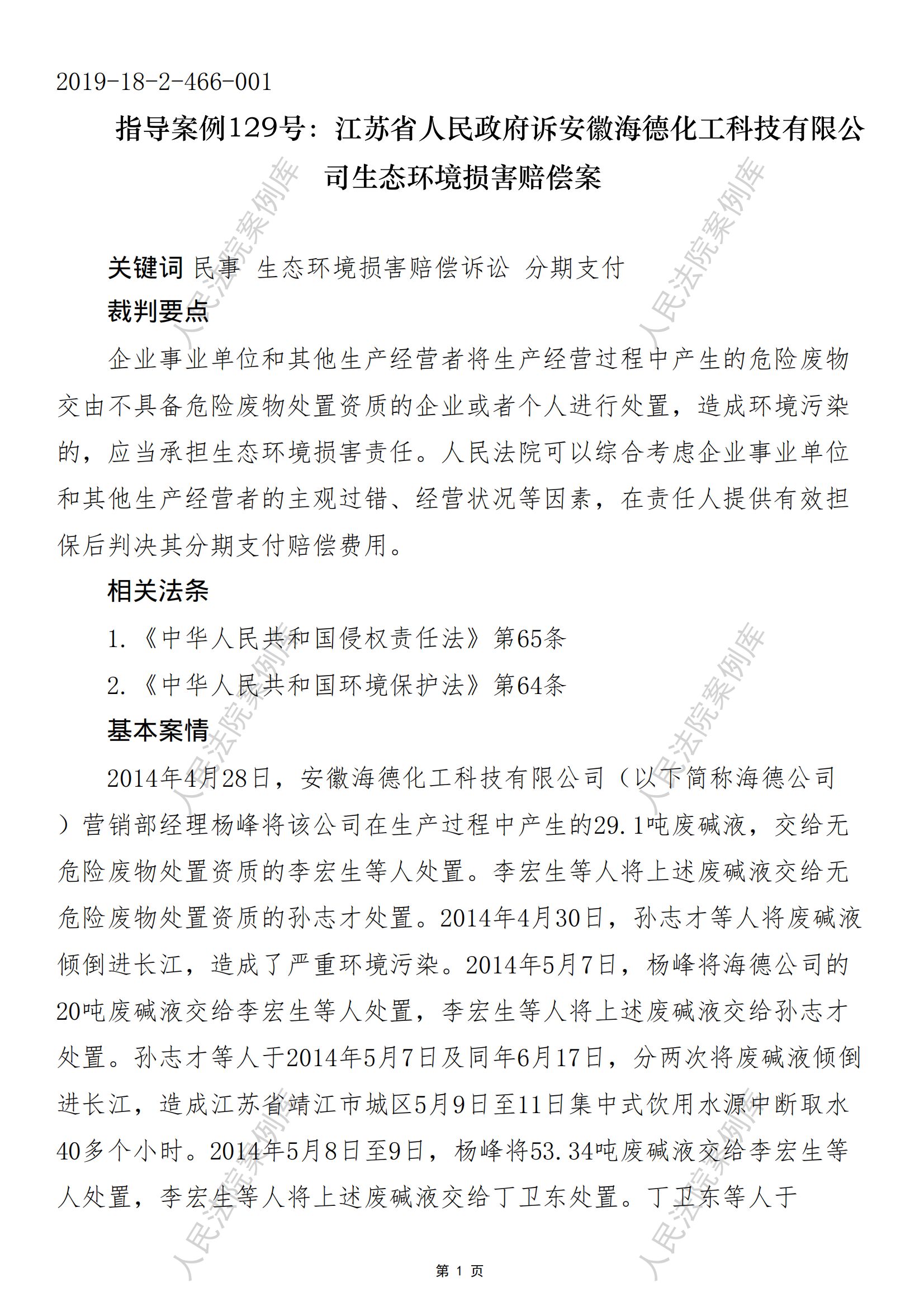 指导案例129号:江苏省人民政府诉安徽海德化工科技有限公司生态环境损害赔偿案