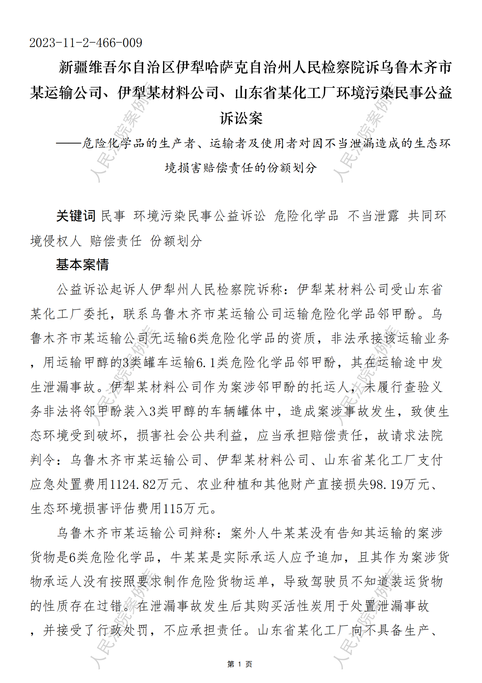 新疆维吾尔自治区伊犁哈萨克自治州人民检察院诉乌鲁木齐市某运输公司、伊犁某材料公司、山东省某化工厂环境污染民事公益诉讼案