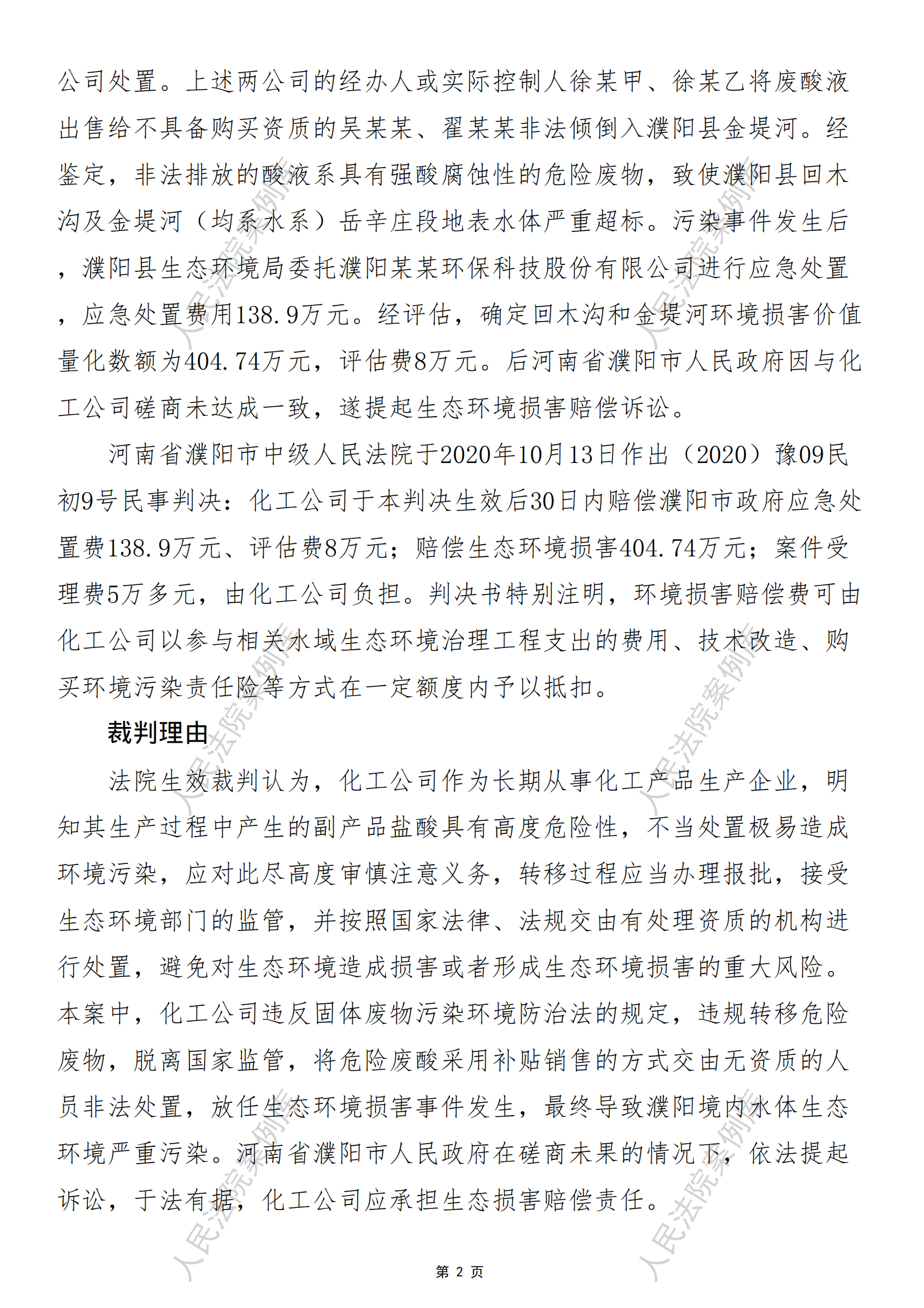 核心提示:——企业违规将副产酸交由不具备处置资质的主体处置,造成生态环境严重损害的,应承担赔偿责任