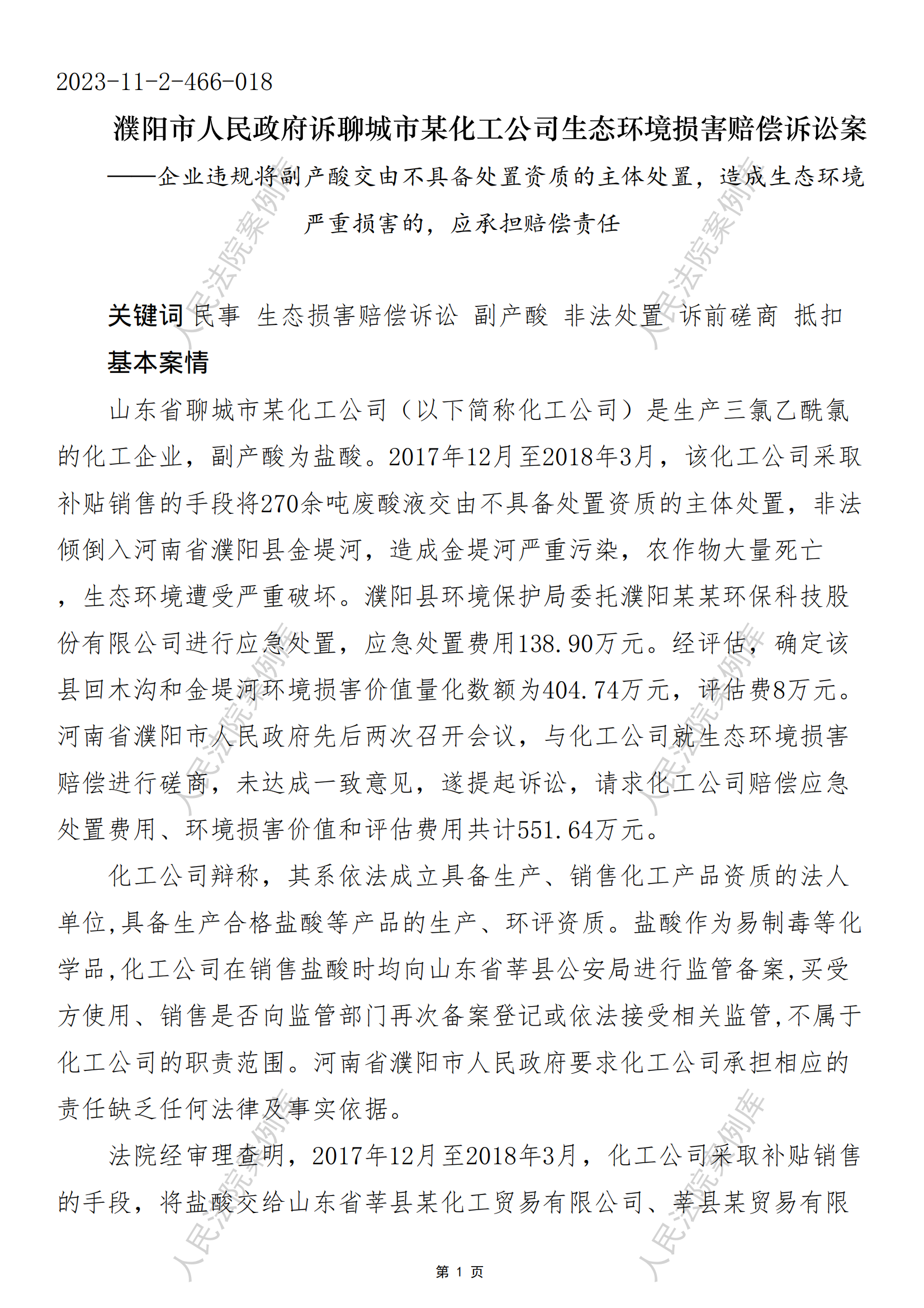 濮阳市人民政府诉聊城市某化工公司生态环境损害赔偿诉讼案