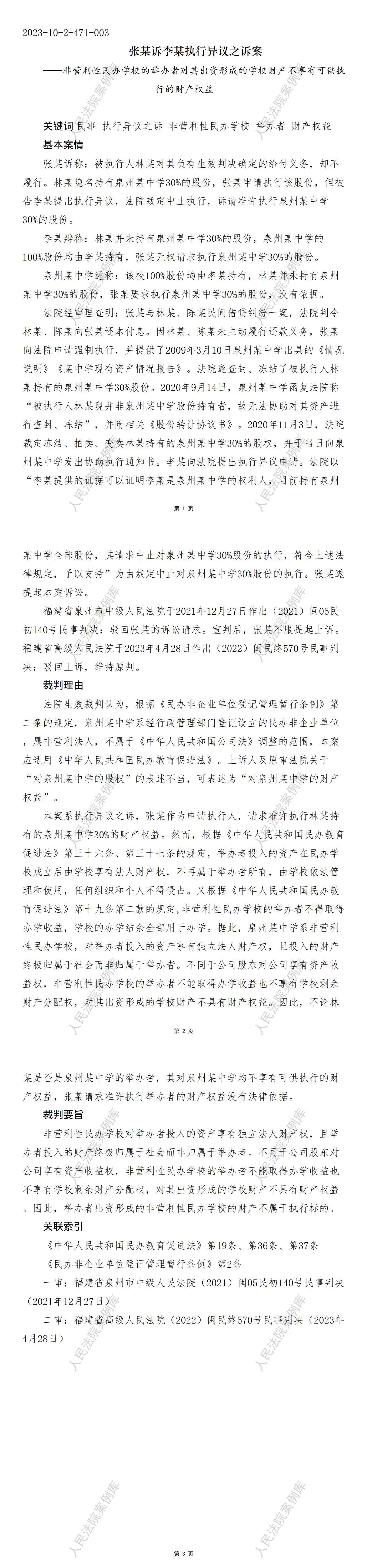 核心提示:——非营利性民办学校的举办者对其出资形成的学校财产不享有可供执行的财产权益