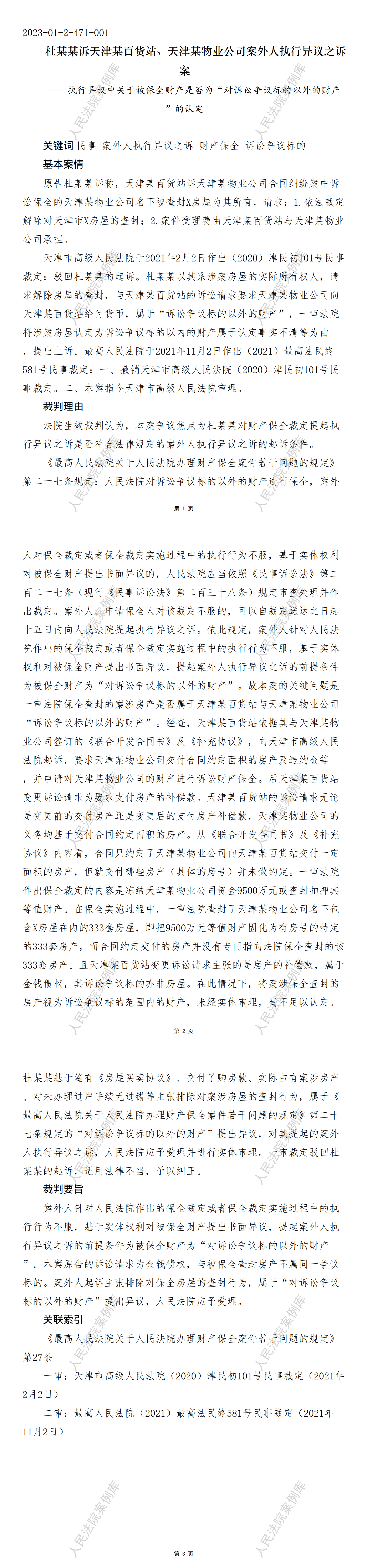 杜某某诉天津某百货站、天津某物业公司案外人执行异议之诉