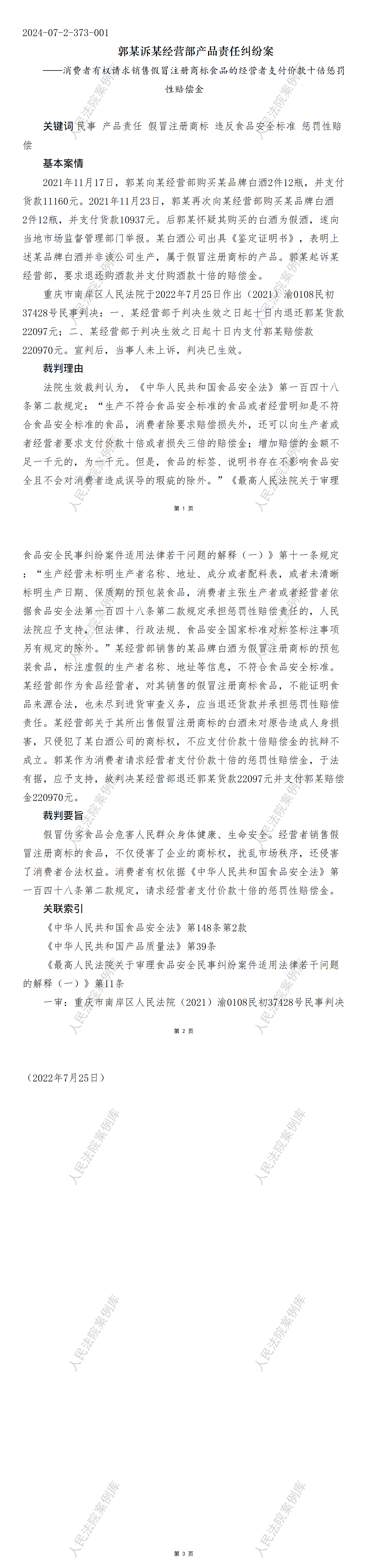 核心提示:——消费者有权请求销售假冒注册商标食品的经营者支付价款十倍惩罚性赔偿金