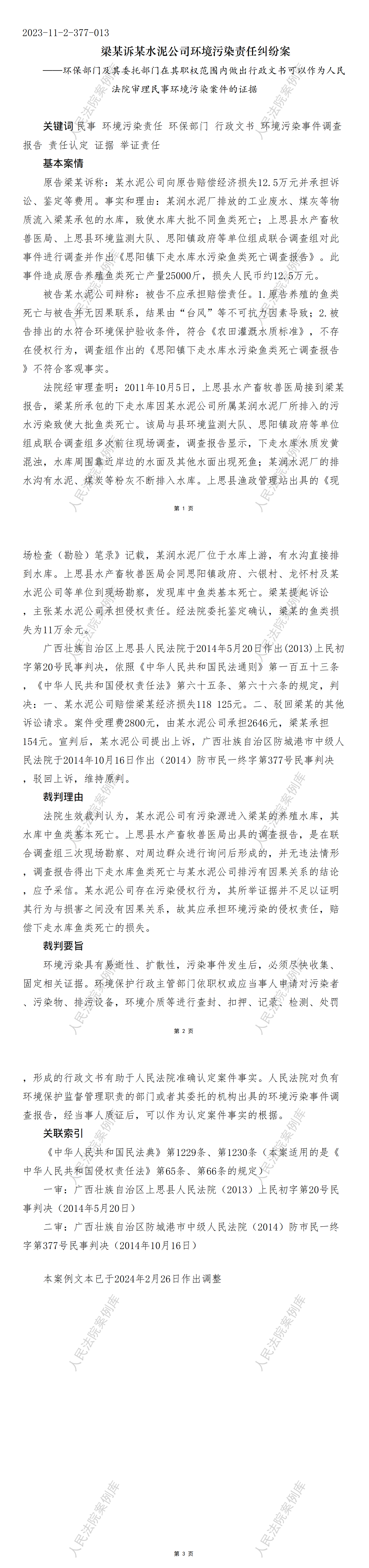 核心提示:——环保部门及其委托部门在其职权范围内做出行政文书可以作为人民法院审理民事环境污染案件的证据