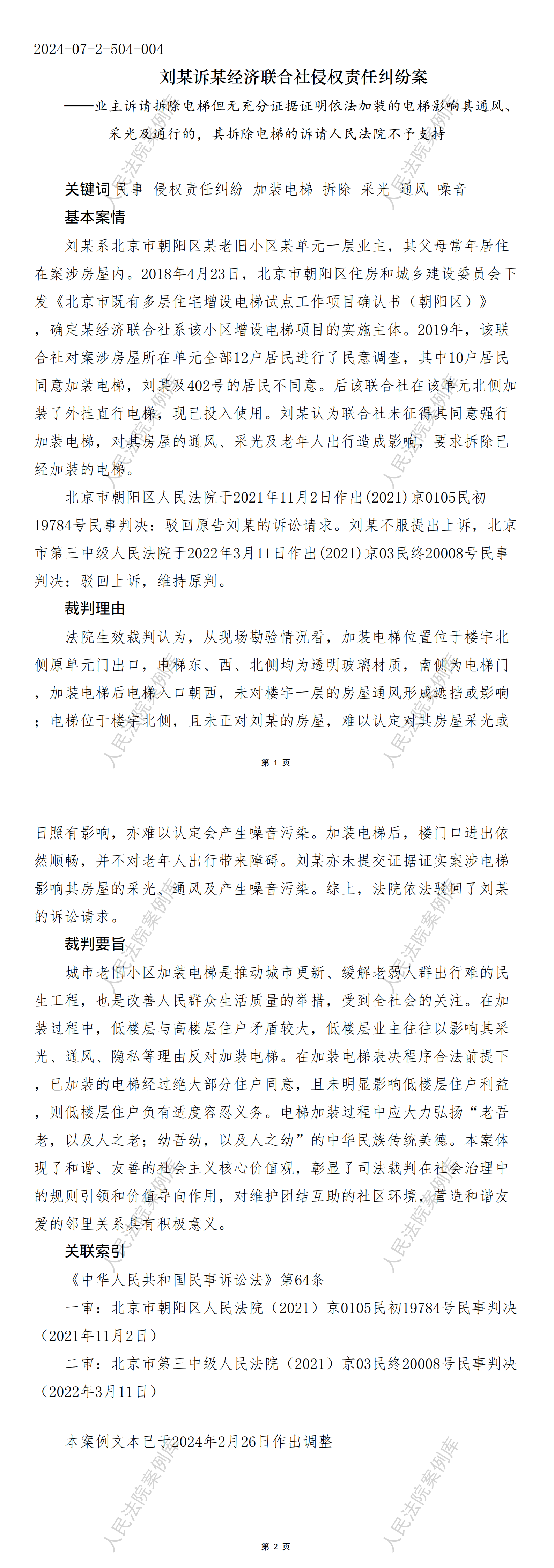 核心提示:——业主诉请拆除电梯但无充分证据证明依法加装的电梯影响其通风、采光及通行的,其拆除电梯的诉请人民法院不予支持